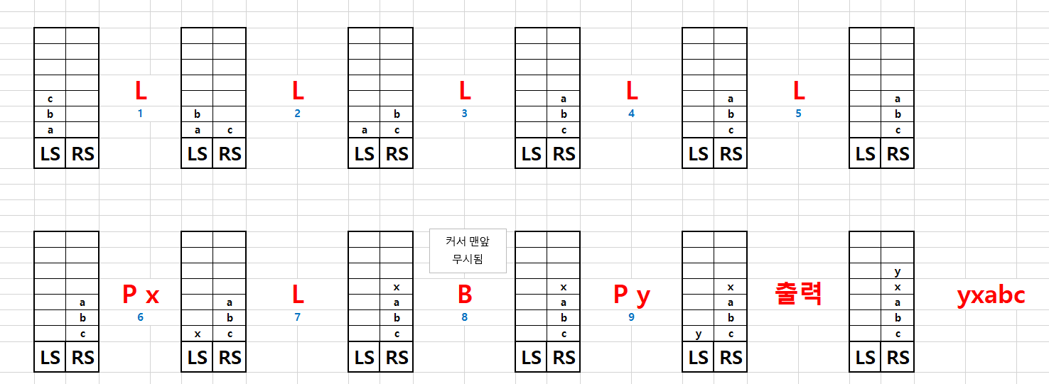 2개의 스택을 이용하는 방법. (LS : LEFT STACK , RS : RIGHT STACK)