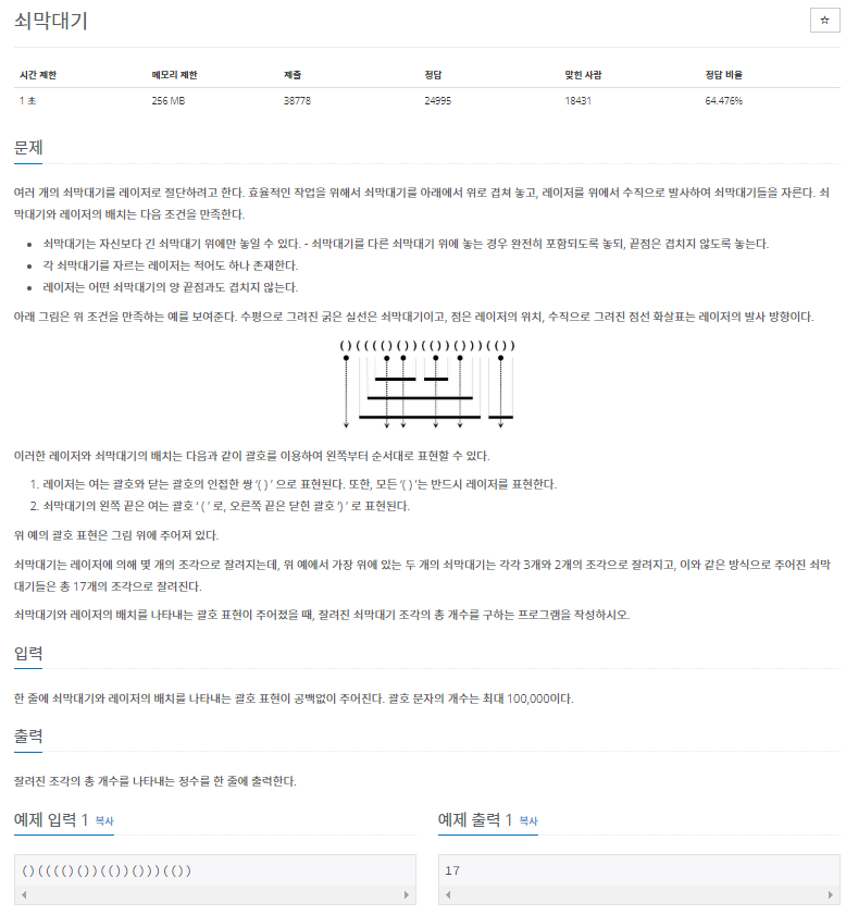 [백준] 201 - 자료구조 1 (연습) : 쇠막대기 (10799번)