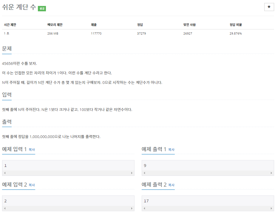 [백준] 400 - 다이나믹 프로그래밍 1 : 쉬운 계단 수 (!) (10844번 JAVA)
