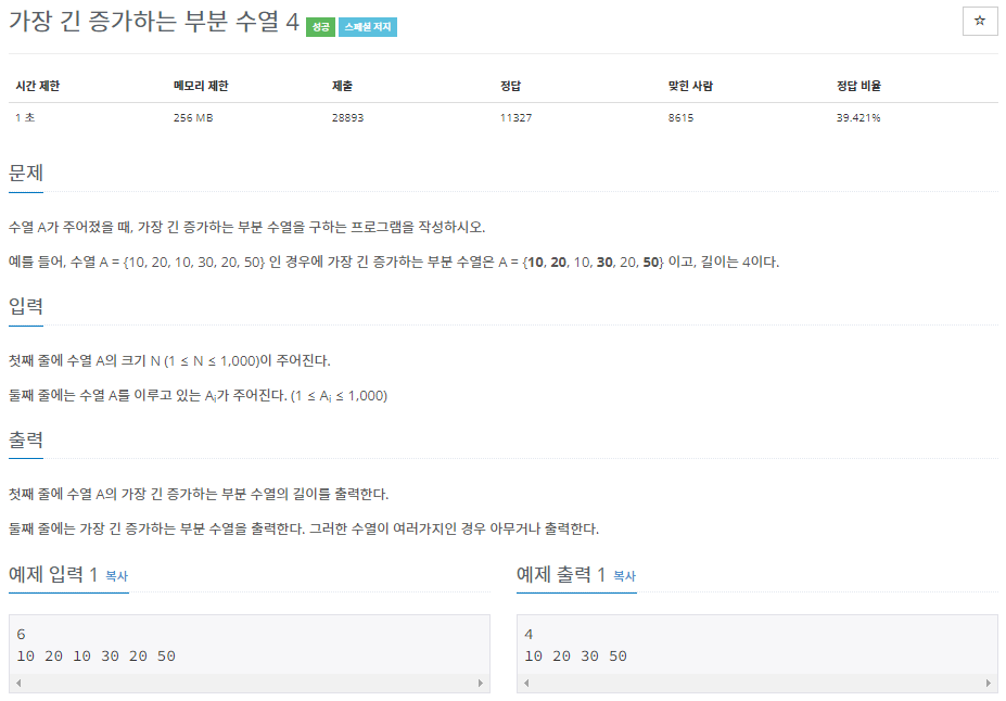 < 가장 긴 증가하는 부분 수열 (11053번 JAVA) > 문제에서 응용이 된 문제이다.