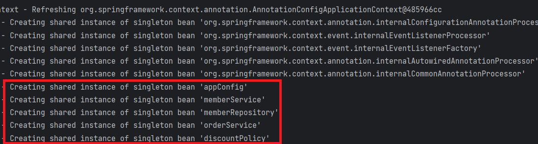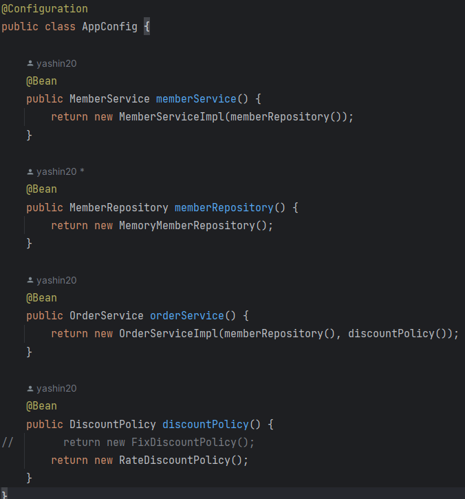 다른 4가지 빈은 @Bean 어노테이션을 통해 스프링 빈으로 관리된다.
