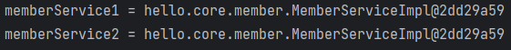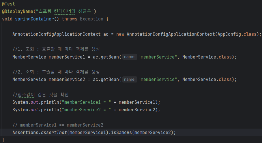 스프링 컨테이너가 관리하는 같은 이름, 같은 타입의 스프링 빈을 2번 조회하였다.