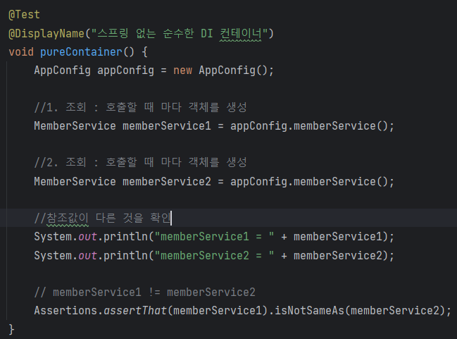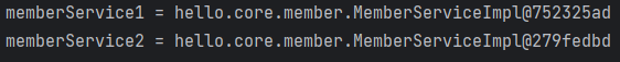 스프링 컨테이너를 사용하지 않고, 'AppConfig.class' 로 같은 타입의 객체 인스턴스를 2개 생성하였다.