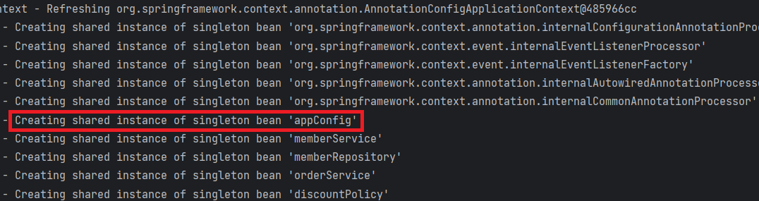 'appConfig' 는 @Configuration 어노테이션이 붙은 'AppConfig.class' 인데, 이것도 스프링 빈으로 관리된다.
