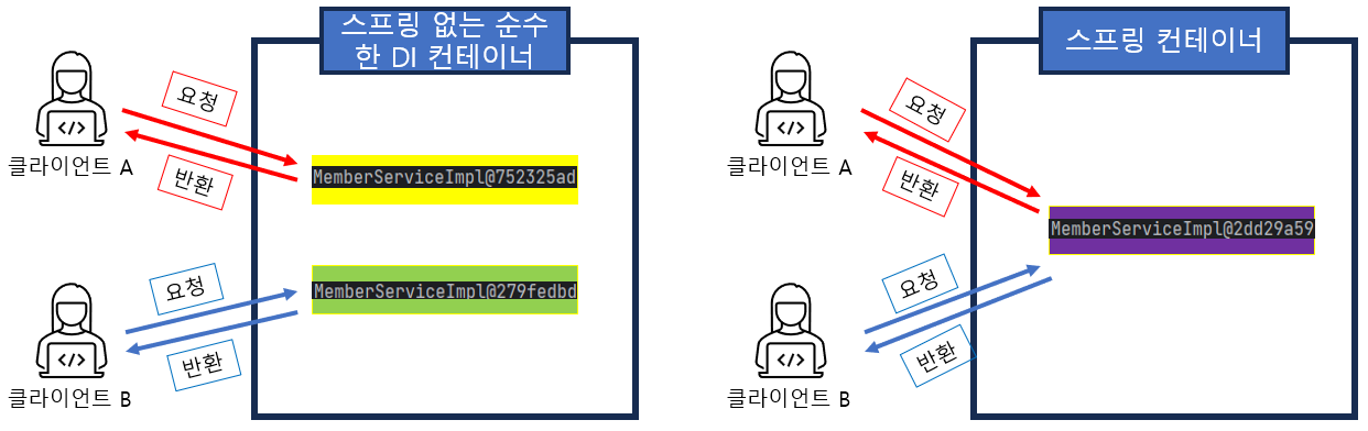 스프링 컨테이너는 스프링 빈을 기본적으로 싱글톤 방식을 통해 관리한다.
