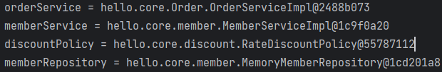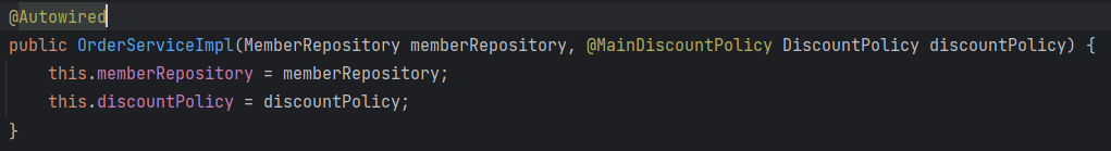 OrderServiceImpl 생성자는 MemberRepository.class 와 DiscountPolicy.class 의 인스턴스 객체를 주입받아야 한다.