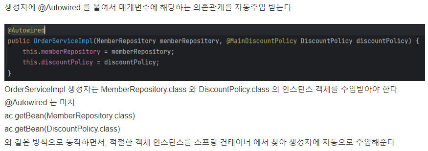 와 같은 방식으로 동작하면서, 적절한 객체 인스턴스를 스프링 컨테이너 에서 찾아 생성자에 자동으로 주입해준다.