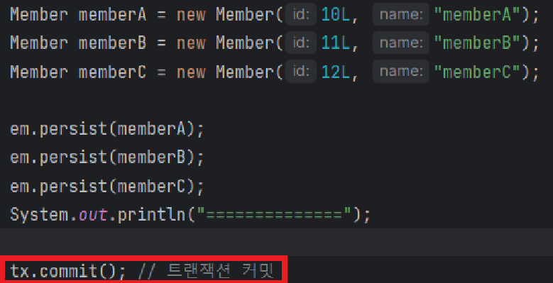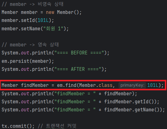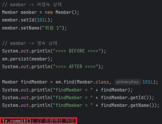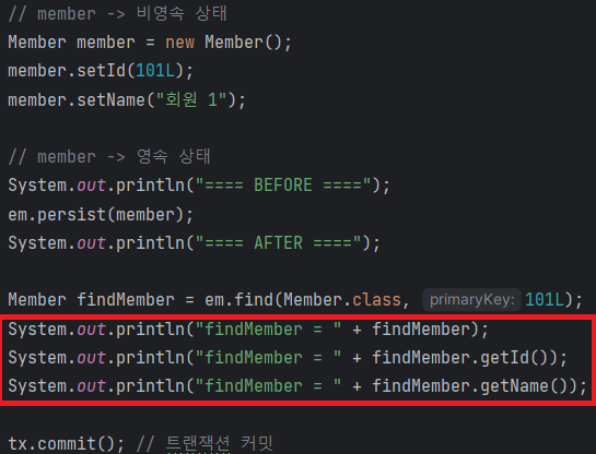 이는 member 객체를 영속성 컨텍스트의 1차 캐시에 저장한다는 의미이다.