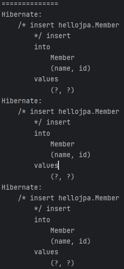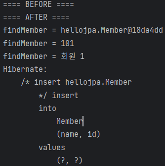'BEFORE 문'과 'AFTER 문' 사이에 "em.persist(member)" 에 대한 로그가 출력되어야 할 것 같지만,