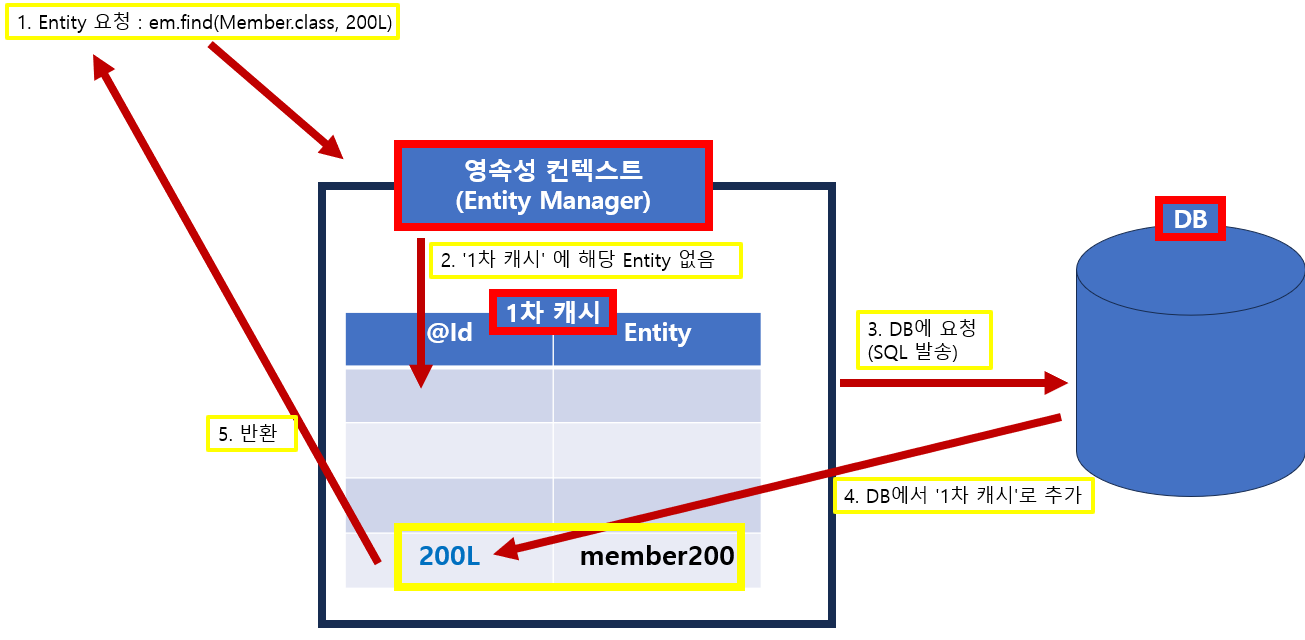 => 현재 영속성 컨텍스트의 1차 캐시는 해당 엔티티를 가지고 있지 않기 때문에, DB에 쿼리를 보내서 1차 캐시로 엔티티를 가져오고 1차 캐시에서 반환한다.