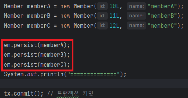 이 시기에 엔티티를 등록하는 SQL 문을 '쓰기 지연 SQL 저장소'에 모아 두었다가.