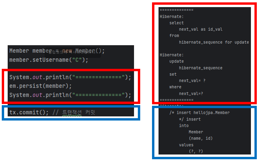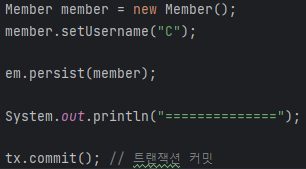 tx.commit() 시점 : 쓰기 지연 SQL 저장소에 쌓인 INSERT 쿼리를 DB로 보낸다.
