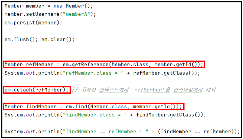 ※ "4. 영속성 컨텍스트에 찾는 엔티티가 있으면, em.getReference()를 호출해도 실제 엔티티 반환" 에 대한 설명