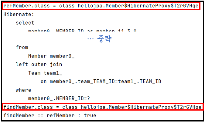 2번 순서에서, em.getReference() 로 호출한 객체 'refMember' 가 프록시 객체로 생성되는 것이 아닌 진짜 객체 (class hellojpa.Member)로 호출된 것을 볼 수 있다.