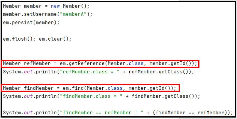 => 영속성 컨텍스트에 찾는 엔티티가 이미 있으면 em.getReference()를 호출해도 실제 엔티티 반환