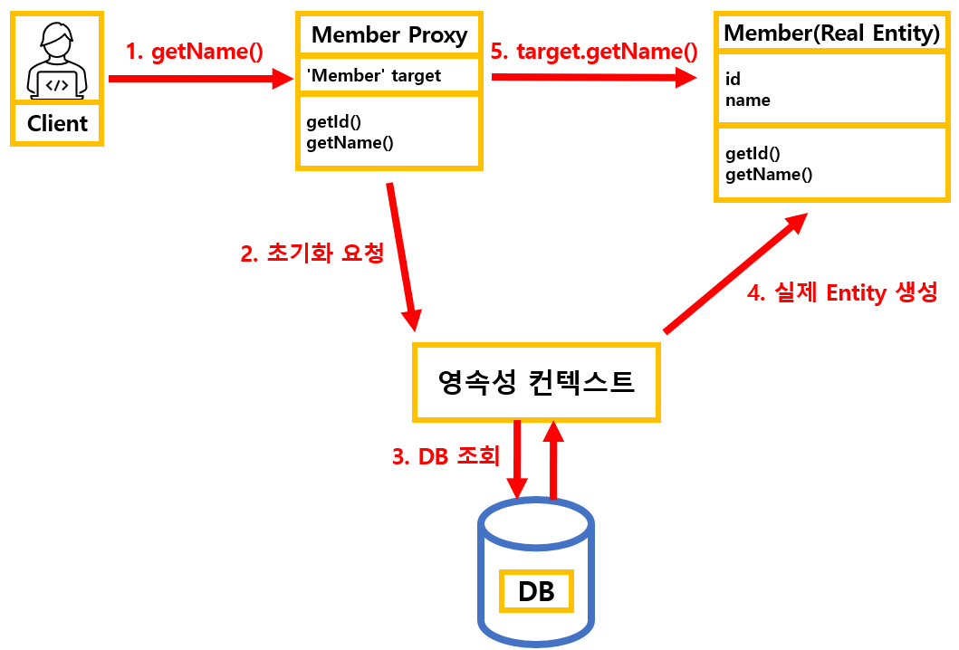 (최초) 실제 값 요청이 왔을때, 영속성 컨텍스트를 통해 DB 조회 하여 실제 Entity를 생성하는 과정
