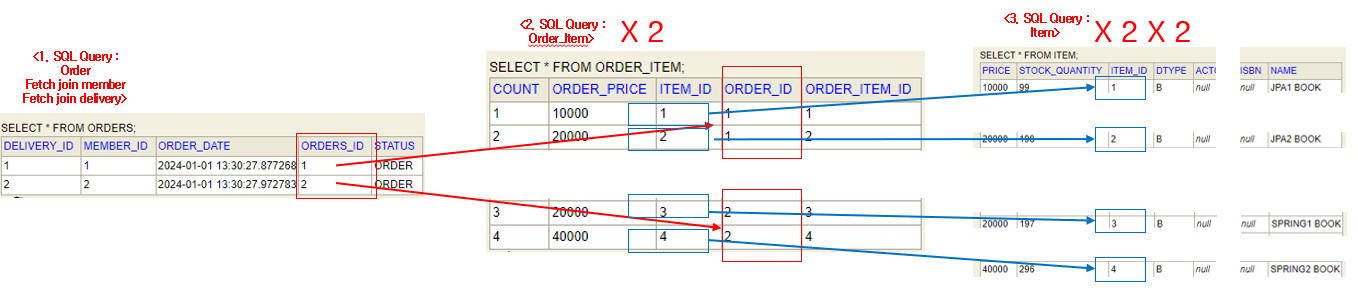 각각의 OrderItem에 대한 Item 2개씩 -> 2개의 Order_Item에 대한 각각 2개의 Item 데이터 조회 -> 2 * 2 = 4개