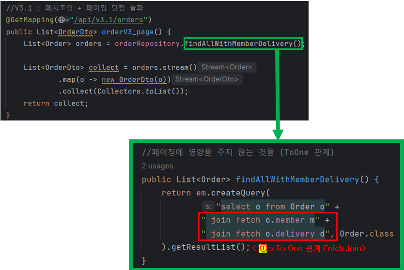 'Member' 와 'Delivery' 를 FetchJoin으로 조회한다.
