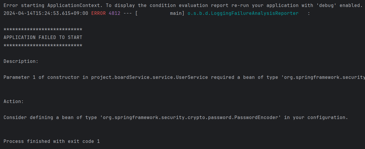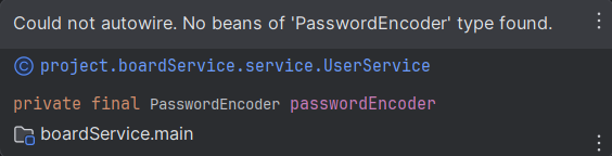 문제 원인은 "PasswordEncoder" 가 빈 주입이 되어 있지 않다는 말이다.