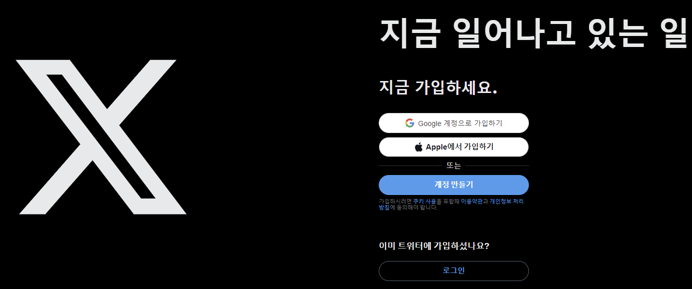 'X' 의 로그인 화면을 보면, 'X'에 직접 계정을 만드는 방식도 존재하지만 'Google', 'Apple'과 같은 다른 서비스의 계정을 통해, 'X'에 가입할 수 있다.