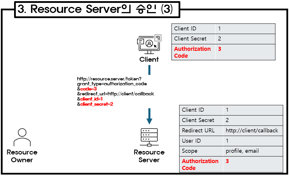 3-3) Client는 'Client ID', 'Client Secret', 'Authorization Code'를 포함하여, R.S에 접속한다.