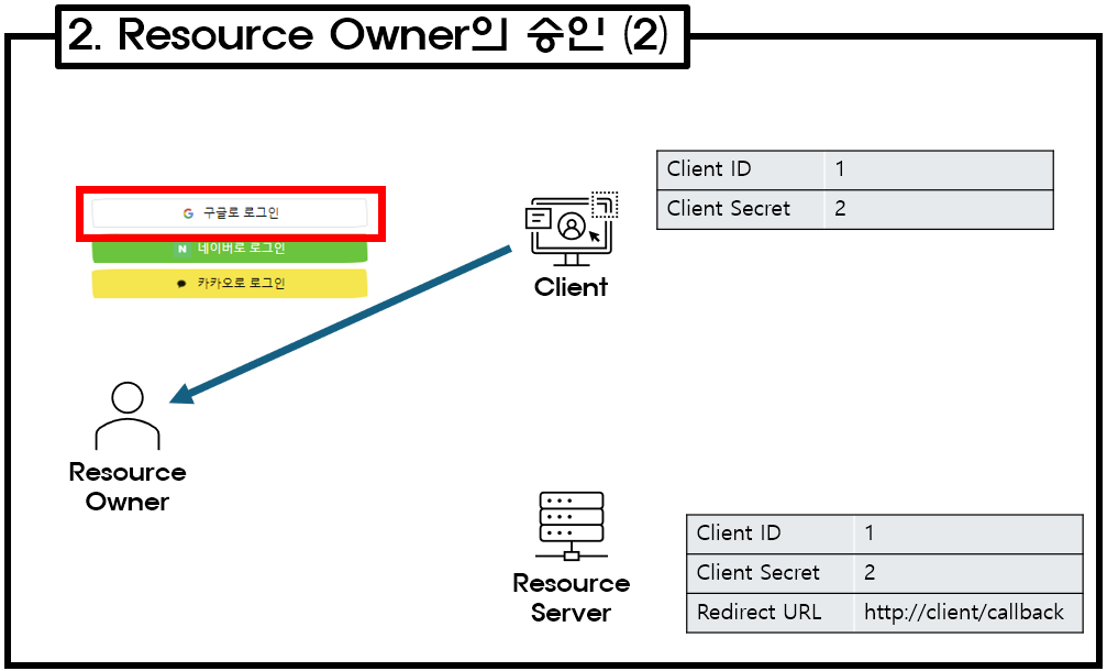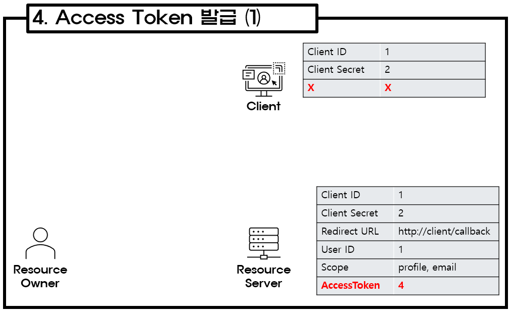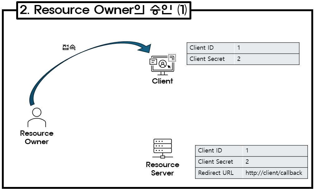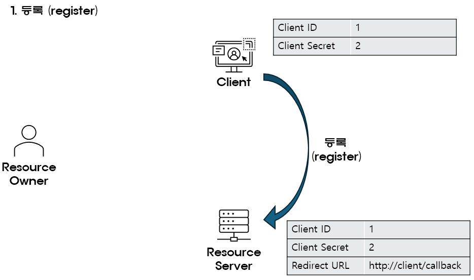 - 'Client'가 'Resource Server'에게 'Client ID', 'Client Secret', 'Redirect URL'을 입력하여 사전 연결을 진행하는 단계