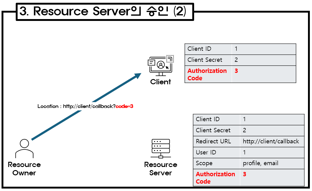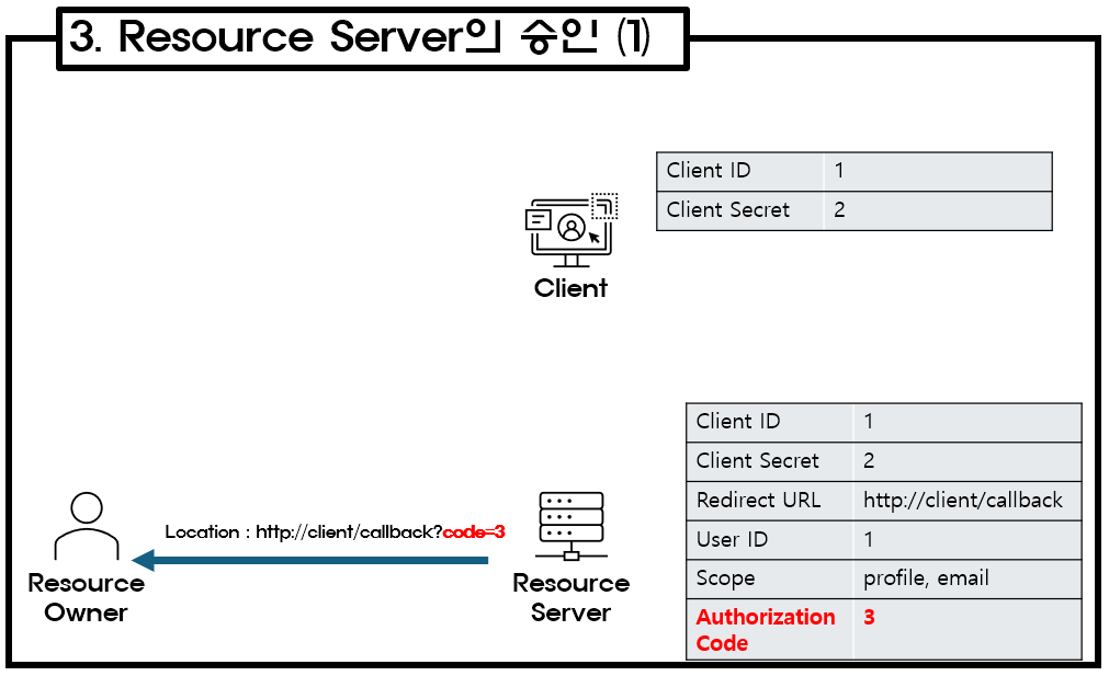 3-1) R.S 가 Authorization Code를 생성한 후, Resource Owner가 "Redirect URL + Authorization Code" URL로 이동시킨다.