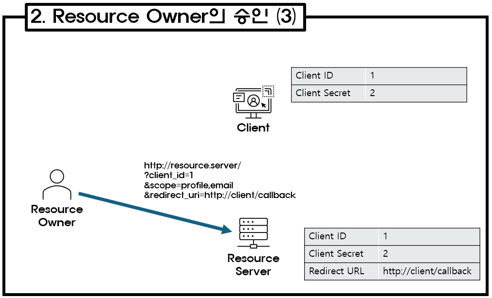 2-4). R.O 가 승인을 한다면, R.S 는 R.O의 식별자인 'User ID' 와 Client 에 대해 승인된 데이터인 'Scope'를 기억하고 있는다.