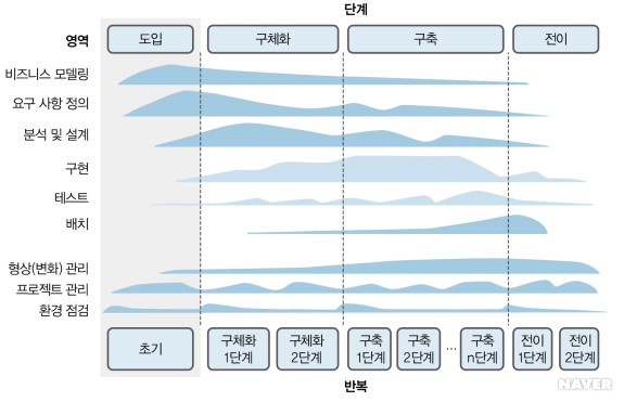cf) 인셉션, 구체화, 구축, 트렌지션 단계에서 형상 및 변화 관리, 프로젝트 관리, 환경 점검 등은 지속적으로 수행분석, 설계, 구현, 테스트 작업은 공통으로 수행(정도의 차이)각 작업 반복