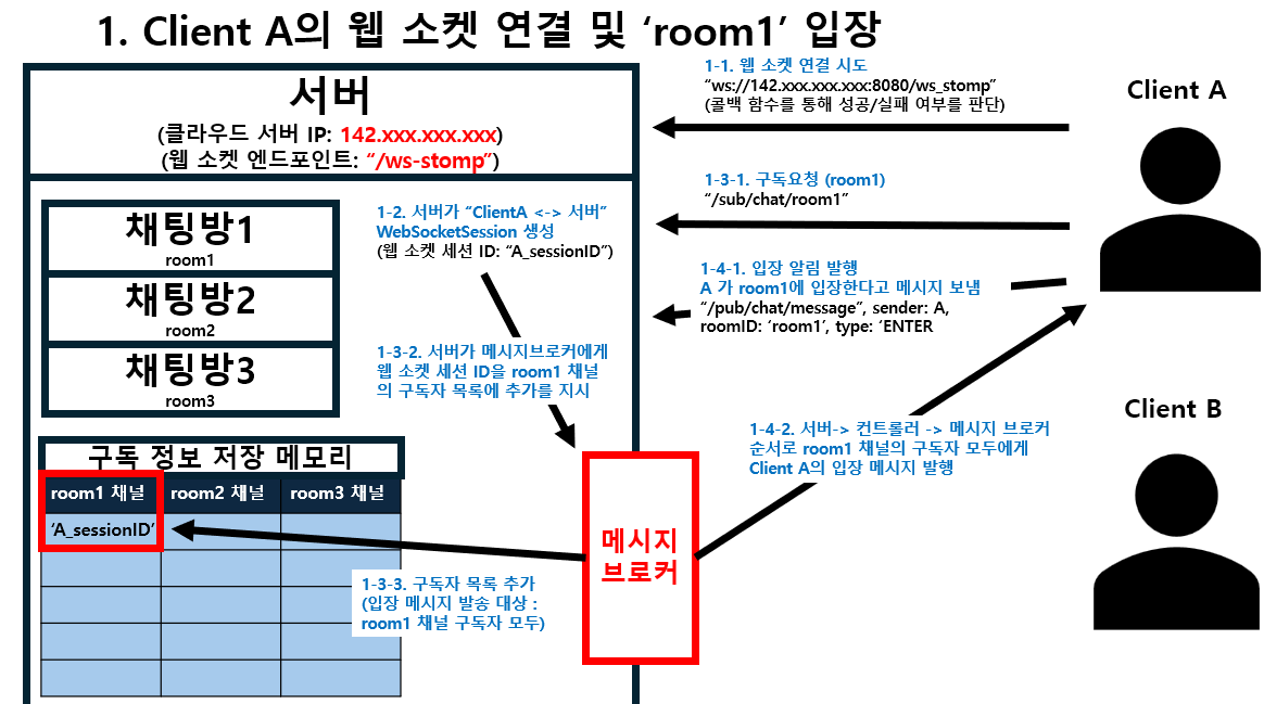 Client A의 웹 소켓 연결 및 'room1' 채널 입장 과정과 동일하다.