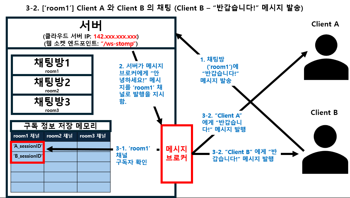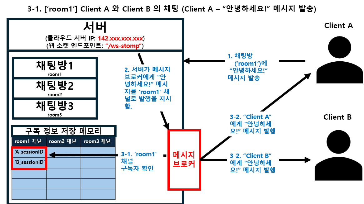3-1. ['room1'] Client A 와 Client B 의 채팅 (Client A - "안녕하세요!" 메시지 발송)