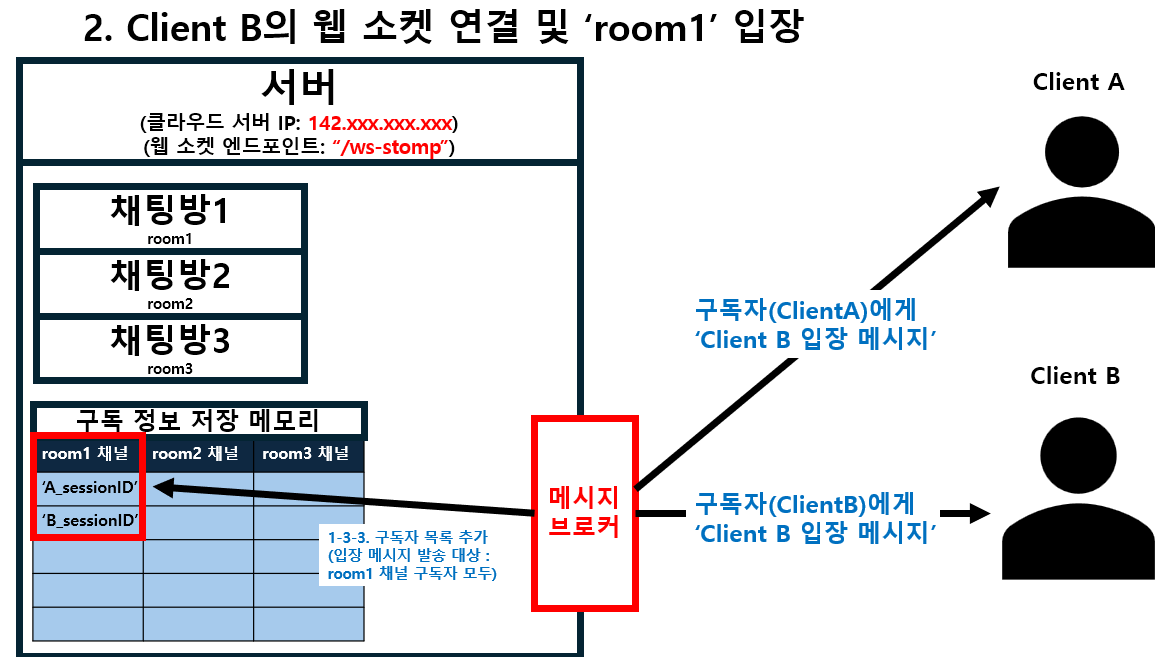 다른 것은 입장 메시지의 발송 대상자가 구독자로 추가된 Client B 도 해당한다.